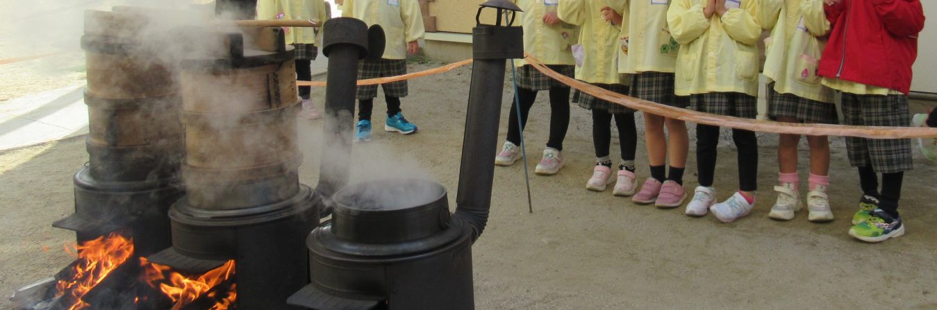 2学期最後の行事 おもちつき。薪に火をつけ、せいろでもち米を蒸し上げる様子を見 …