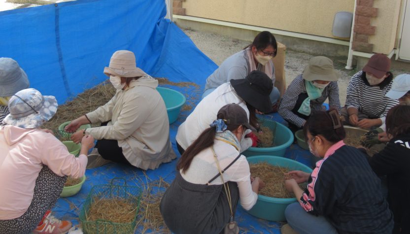 しっかりと乾燥させた稲🌾を持って1人ずつ脱穀という作業を行った年長さん。ボランティアで来て下さったお父さんが足踏み脱穀機を回し、稲を置くと「カラカラカラ」と音を立てて、一粒一粒のもみになりました。「おもしろかった」「すごい!!」と子どもたちの声が聞こえてきました✨