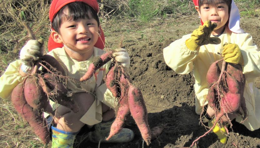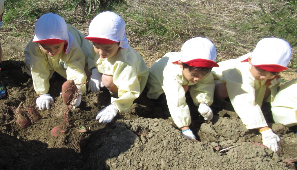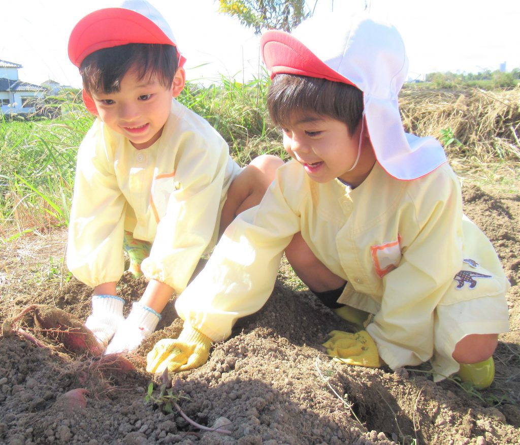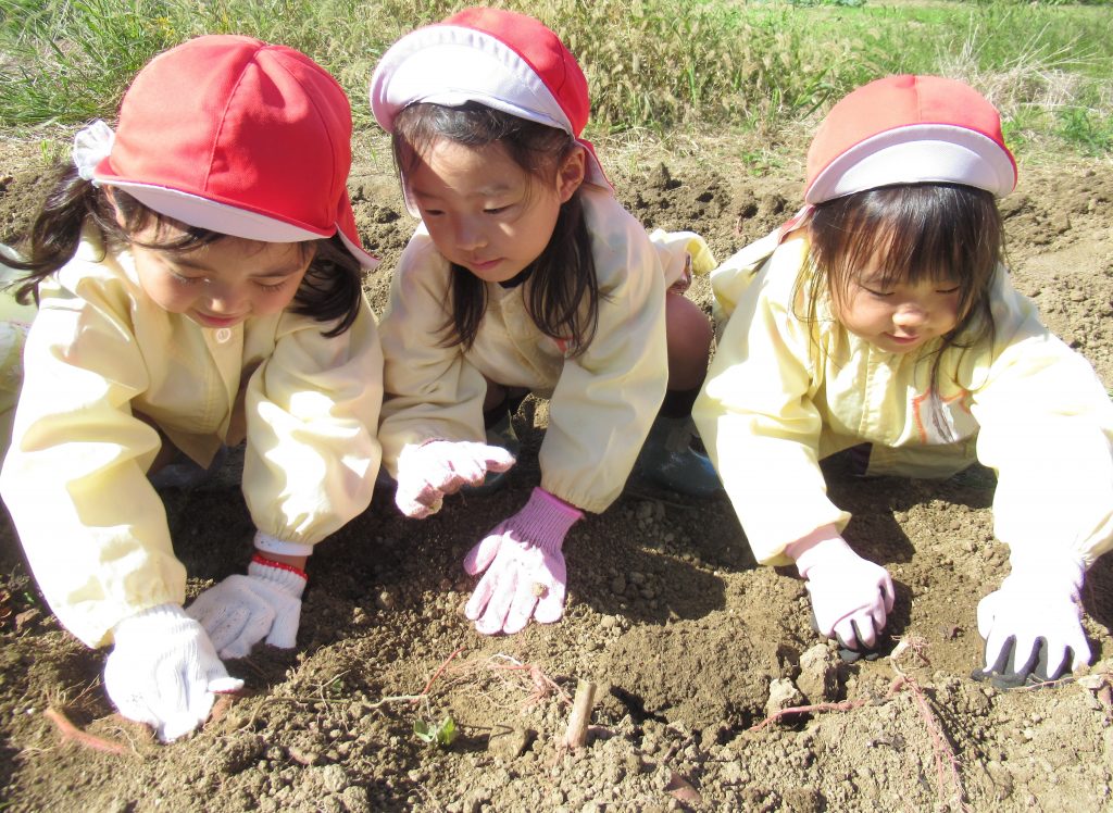 土の中に隠れているさつまいもを探すために、一生懸命土をかき分ける子どもたち。さつまいもを見つけると「あった!!」「見て見て」と大喜びでした。