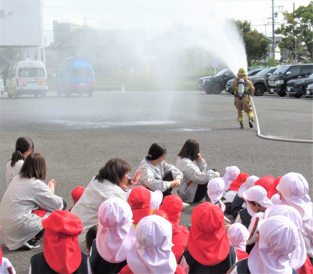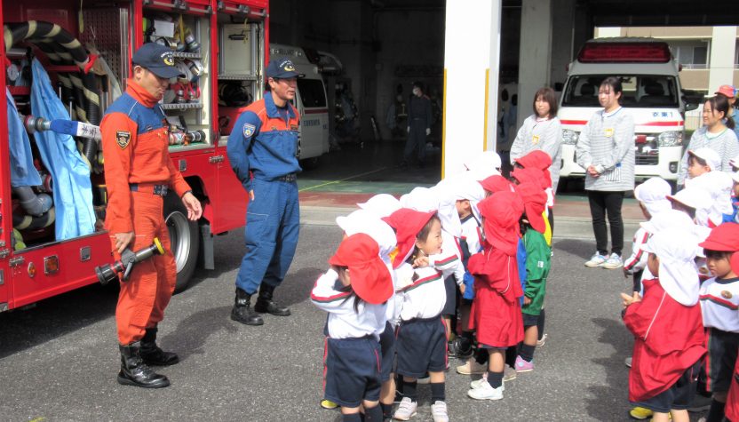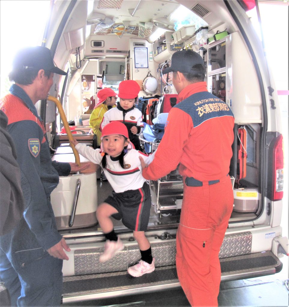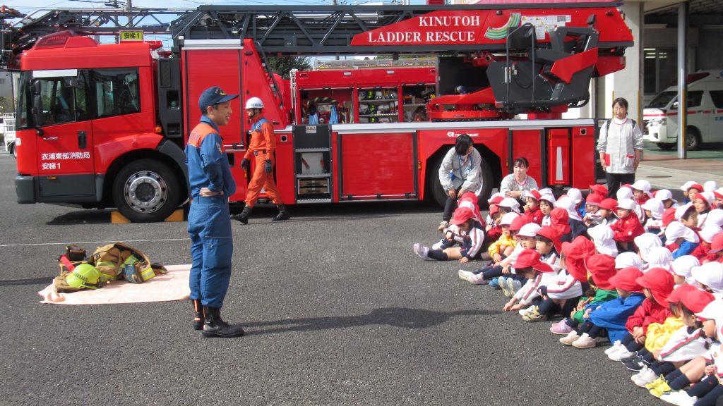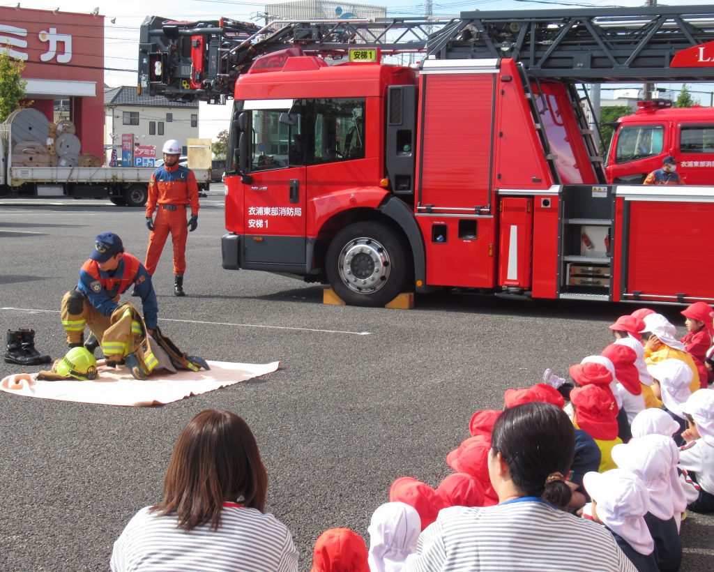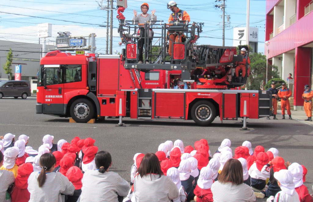 特別に救急車に乗せてもらったり、放水の様子を見たり。また はしご車が空に向かって上がっていく時には 「高いねえ」「先生、がんばって」と乗っている先生に手を振る姿もありました。