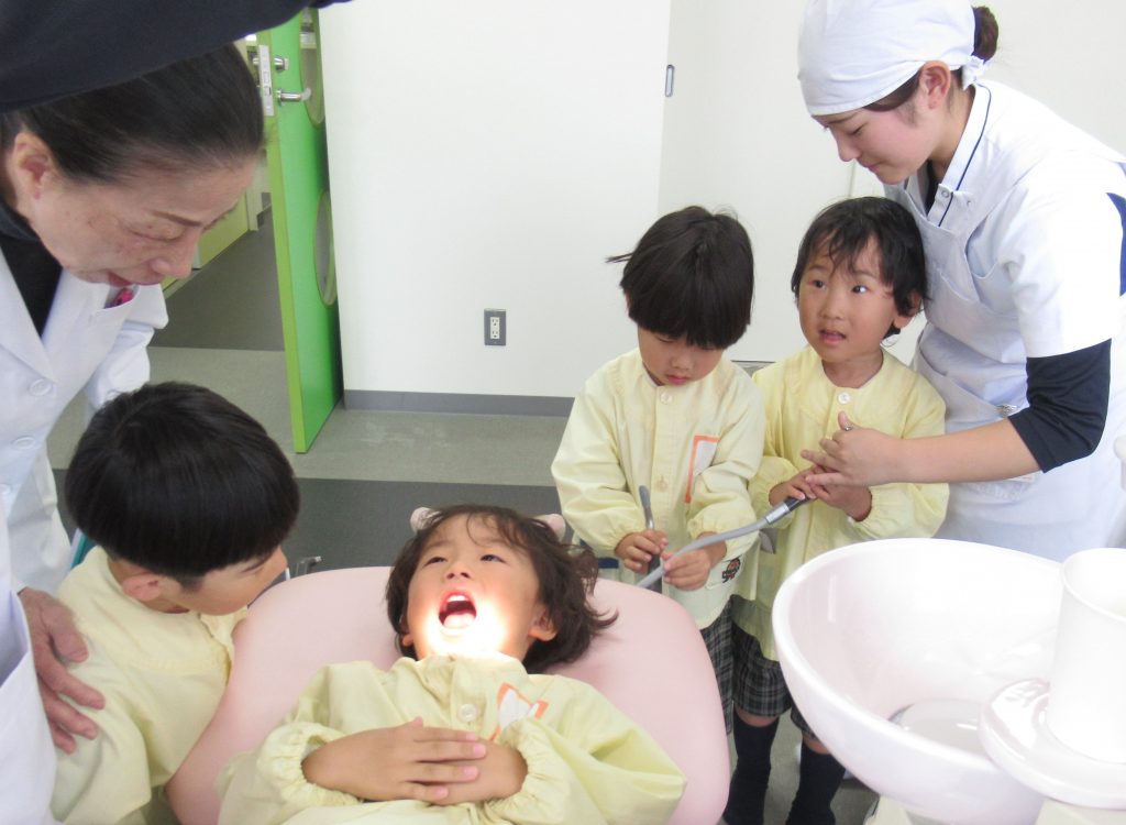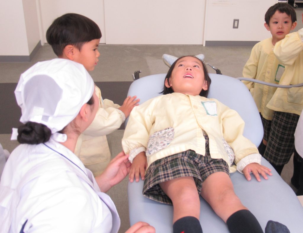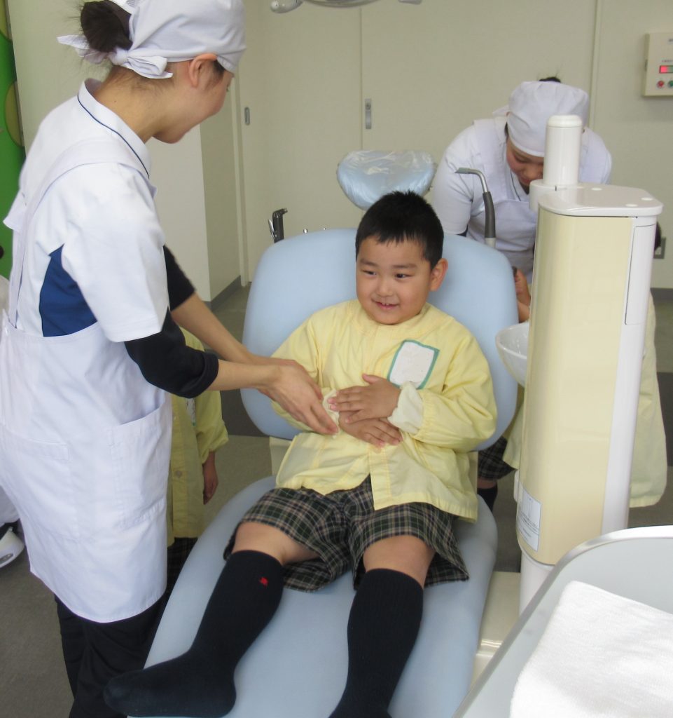 年中さんは姉妹校である歯科医療専門学校で歯🦷について教えていただきました。歯医者にある器具を実際に触らせていただいたり、治療するための椅子にも座ったり。