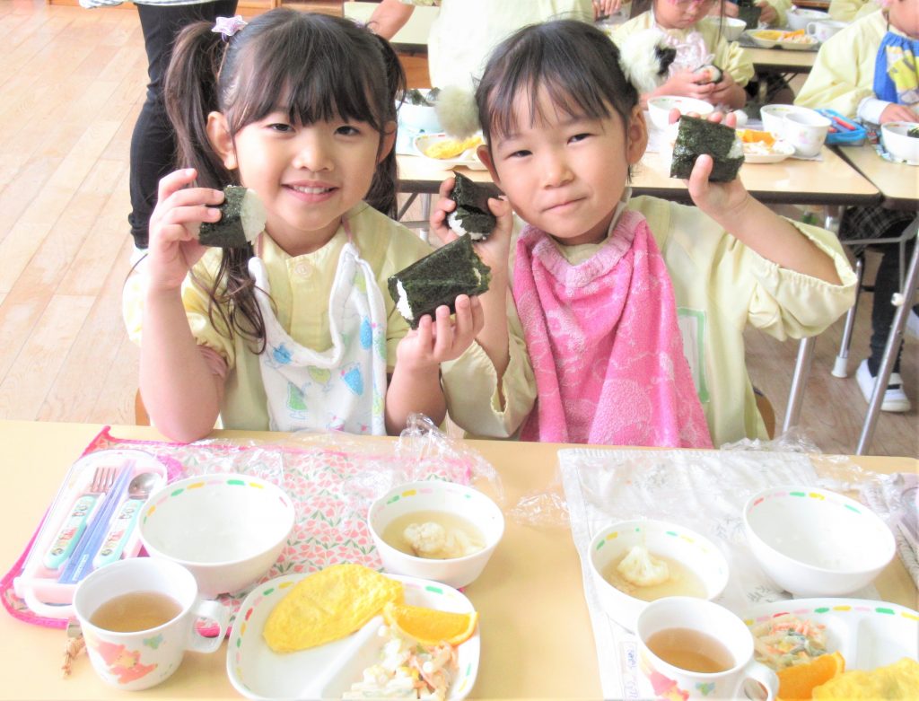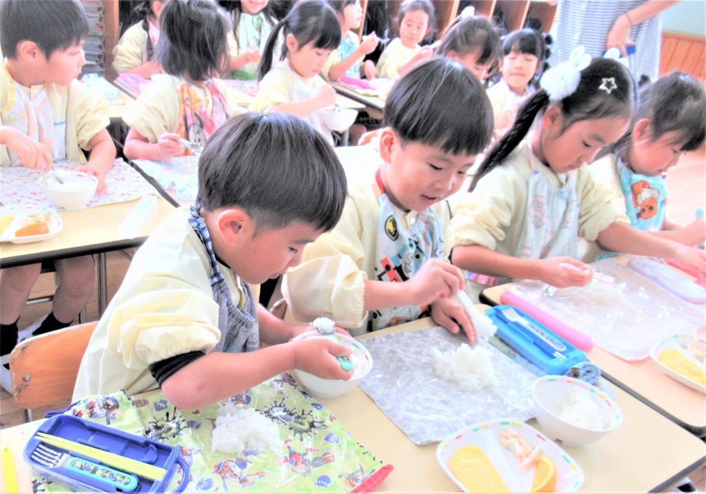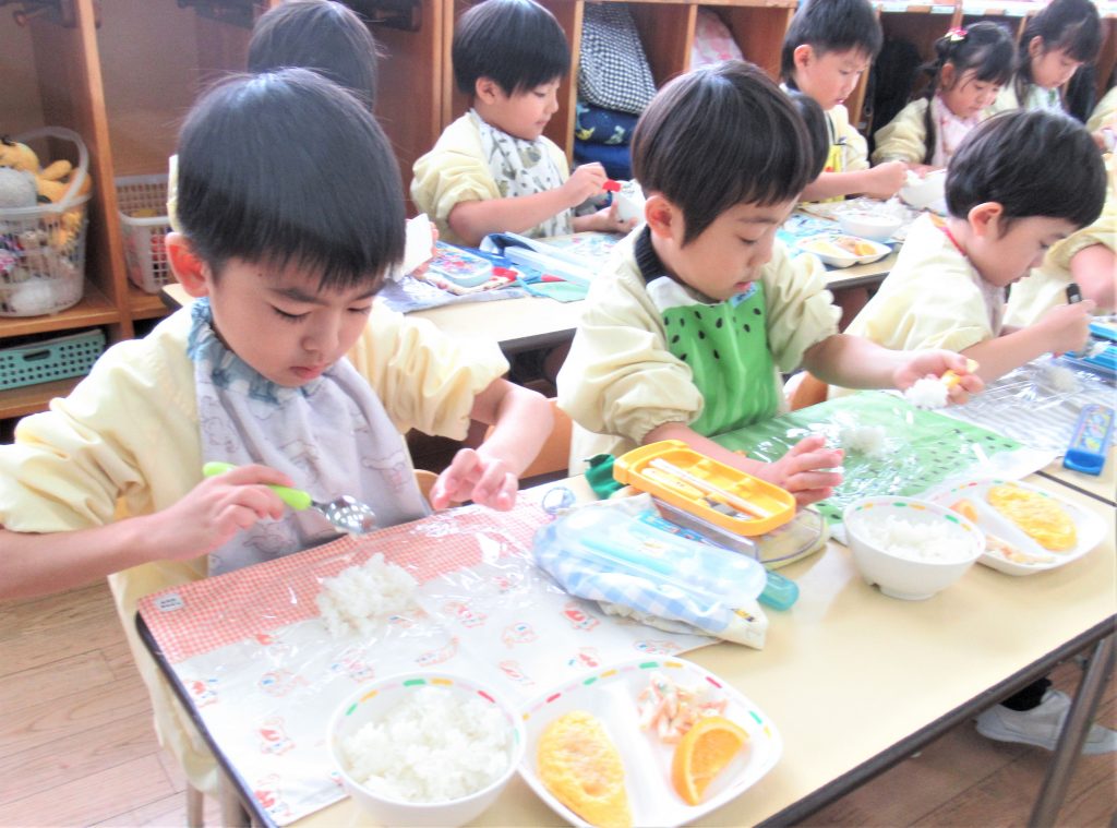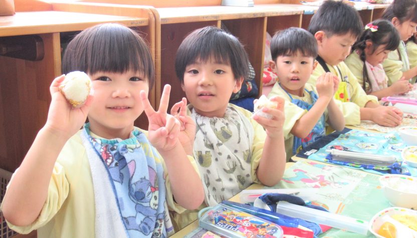 お買い物体験で買ってきた具材を入れて、「まるにしよう」「見て見て」と自分で考えた型ににぎり、おいしく食べることができました🍙