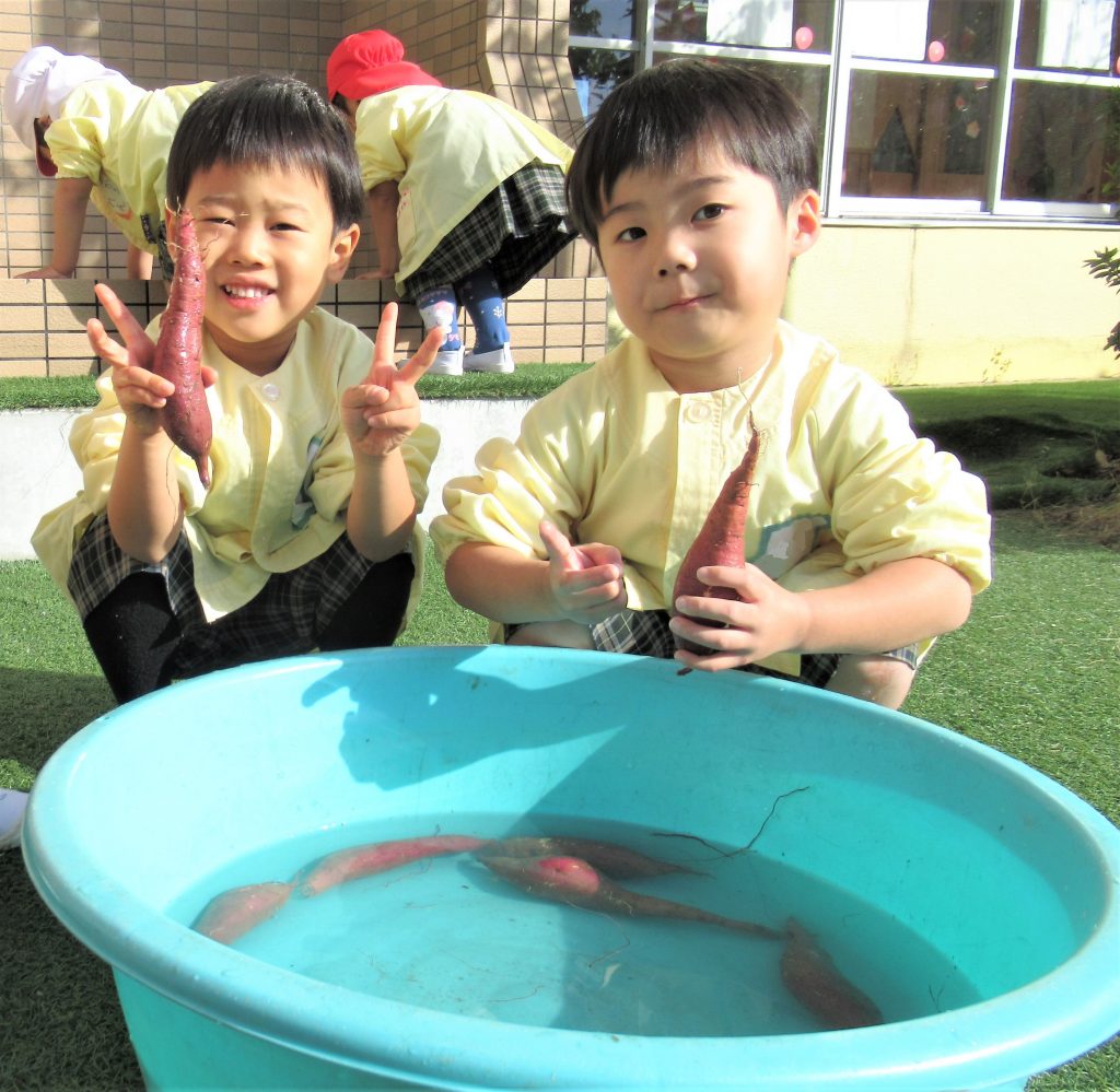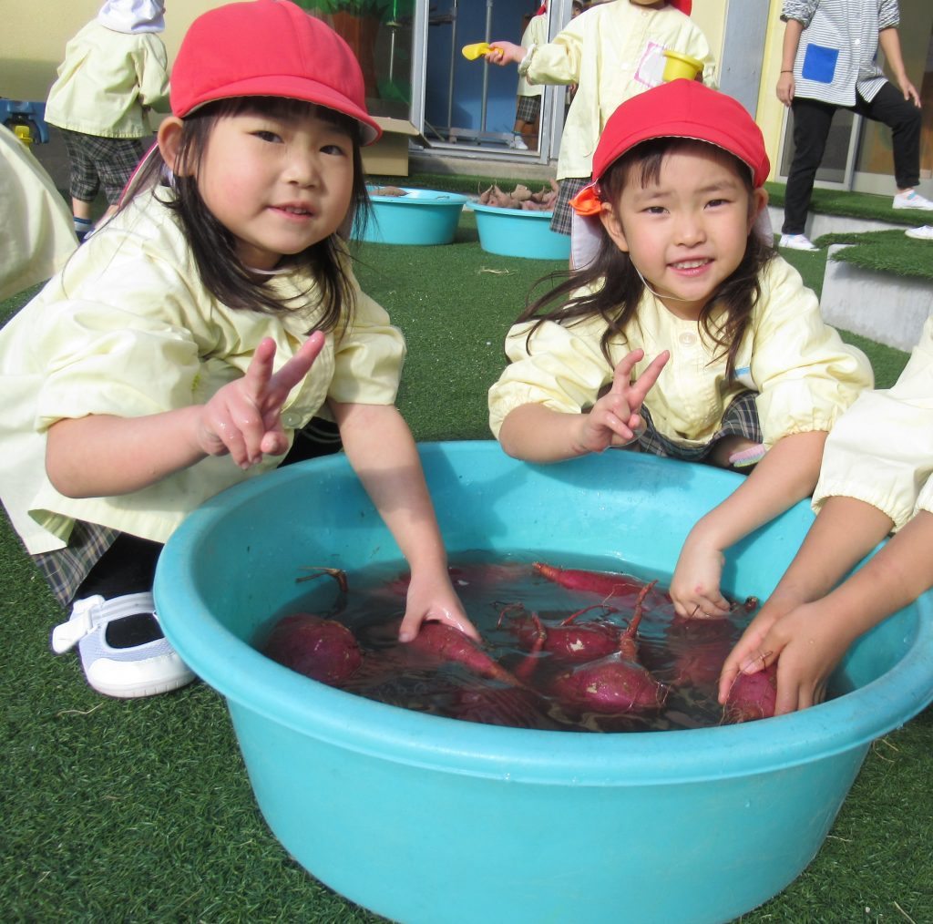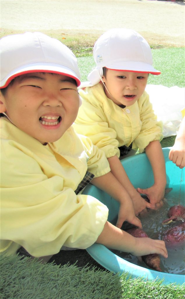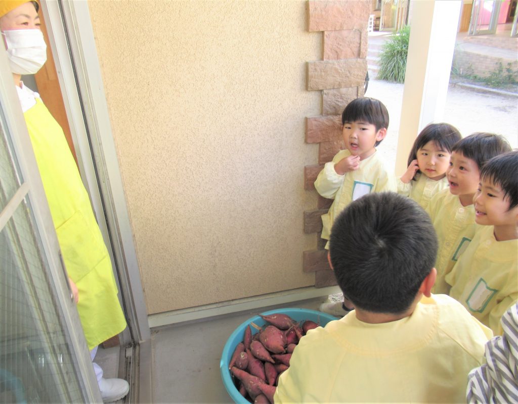 年中さんが収穫したさつまいもを給食室で調理してもらうために、みんなでさつまいもを洗いました。たくさんのさつまいもを給食室へ運び、調理師さんへお願いしました。