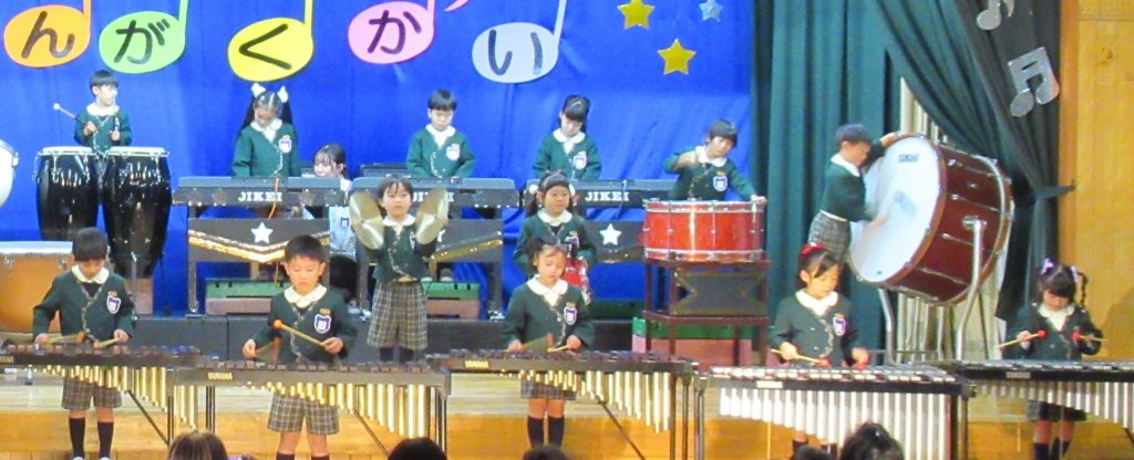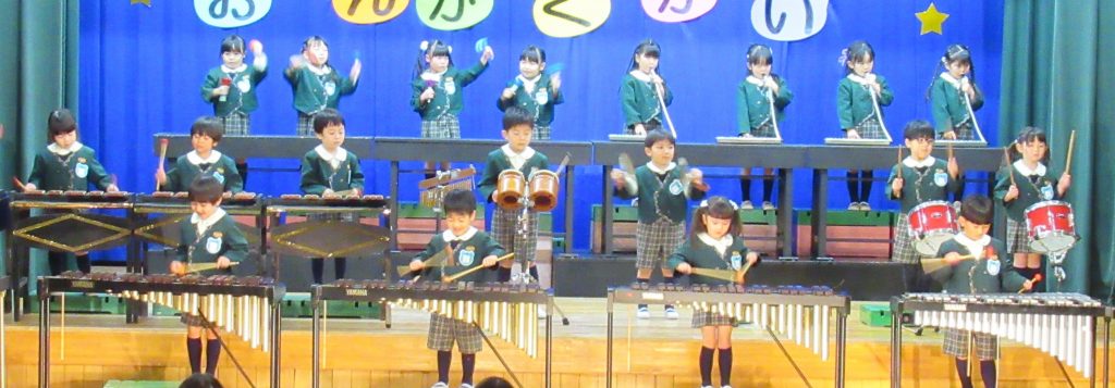 練習の時から「今日 お客さんいないねぇ」とお家の人に観てもらう日を楽しみにしていた年少さん。当日は幕が上がりたくさんのお客さんを見つけると笑顔で手を振る子、緊張してしまう子、いろんな姿がありました。どの子も自分の担当の楽器を楽しく鳴らし、かわいい音楽会になりました♪