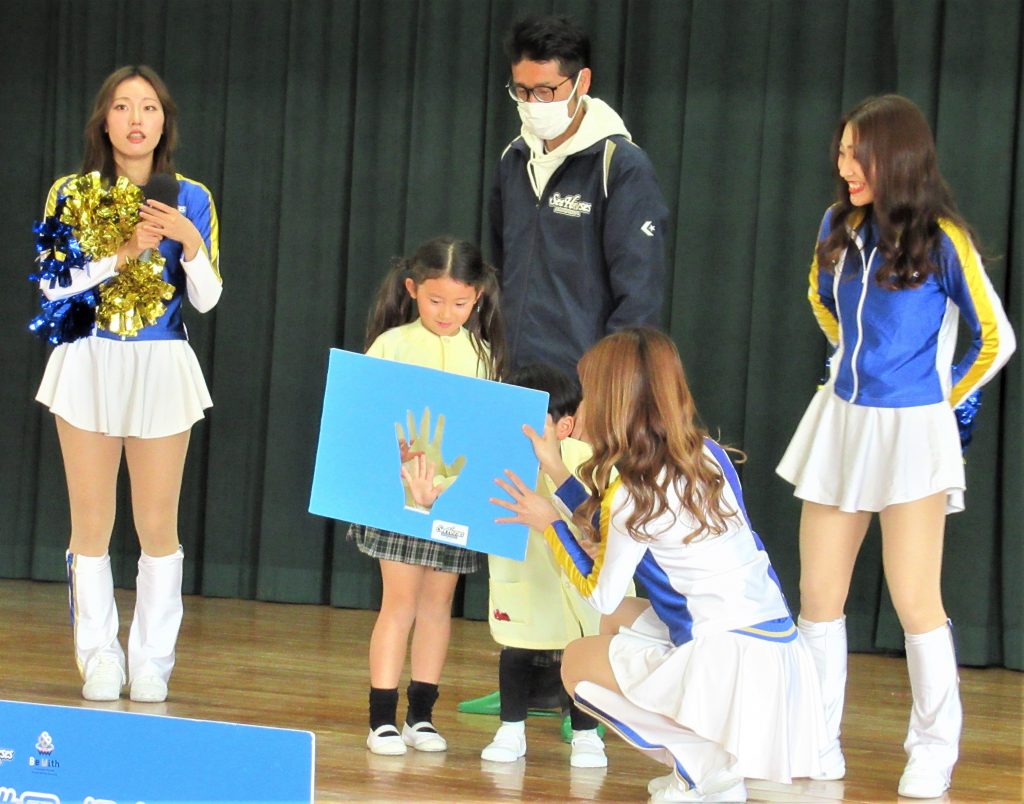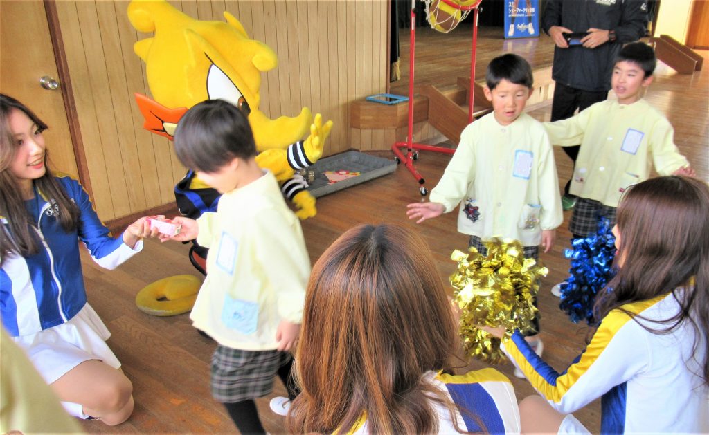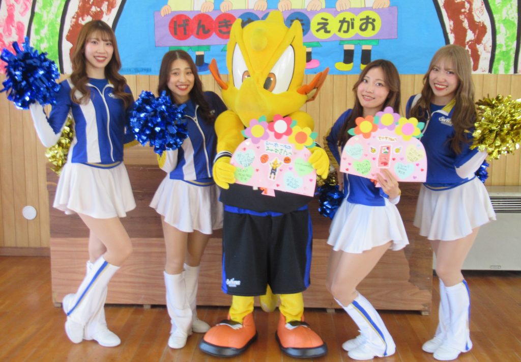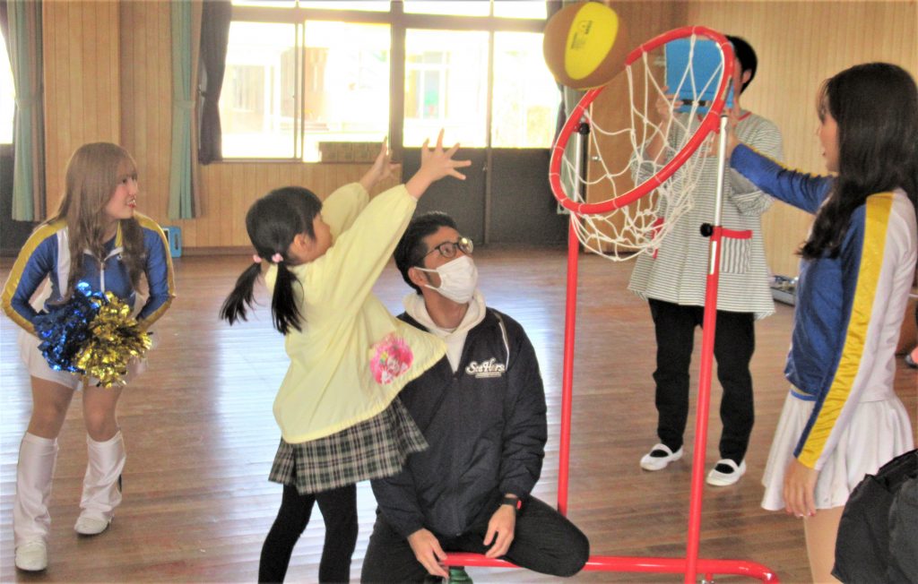 1月19日 バスケットボールチーム🏀「シーホース三河」のチアガールとシーホースくんが来園しました。一緒にダンスをしたり、バスケットボール選手についてのクイズをしたり、楽しく過しました。年長さんは実際にバスケットボール🏀をゴールにシュートする体験をさせてもらうことができ、バスケット選手気分を味わいました。