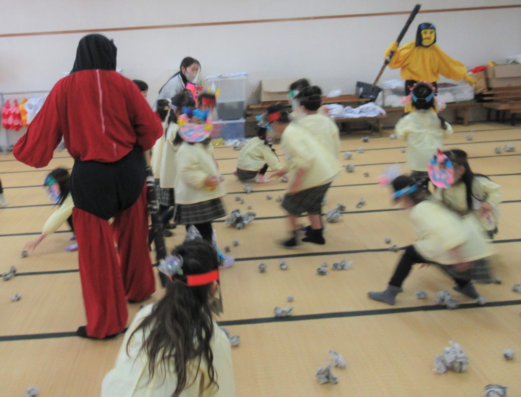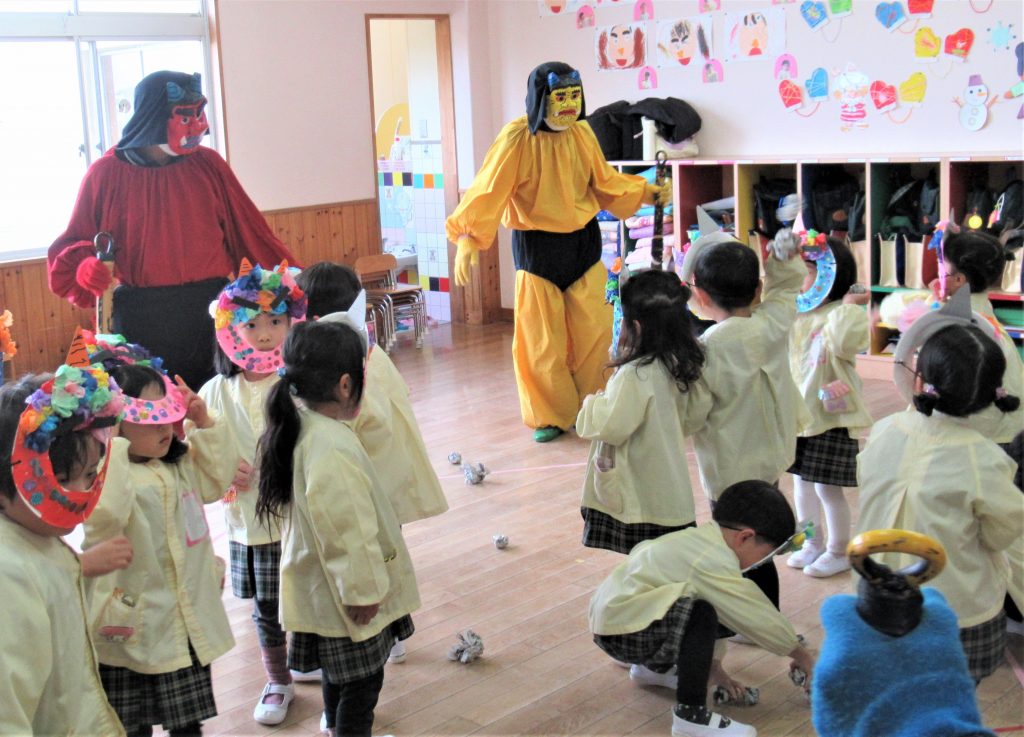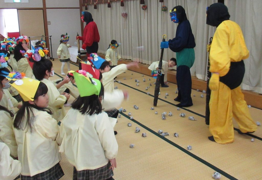 「心の中にいる『泣き虫おに』『イヤだイヤだおに』『いじわるおに』を追いだすために、豆まきをするよ」1月29日 豆まきをしました。個性豊かなおにのお面をつけた子どもたち。「おには外」と豆のかわりに丸めた新聞紙を投げていると、目の前に赤鬼、青鬼、黄色鬼が現れました。少し怖がる子もいましたが、新聞紙まめを一生懸命投げ、最後には鬼たちと仲良くなって無事に豆まきを終えました。